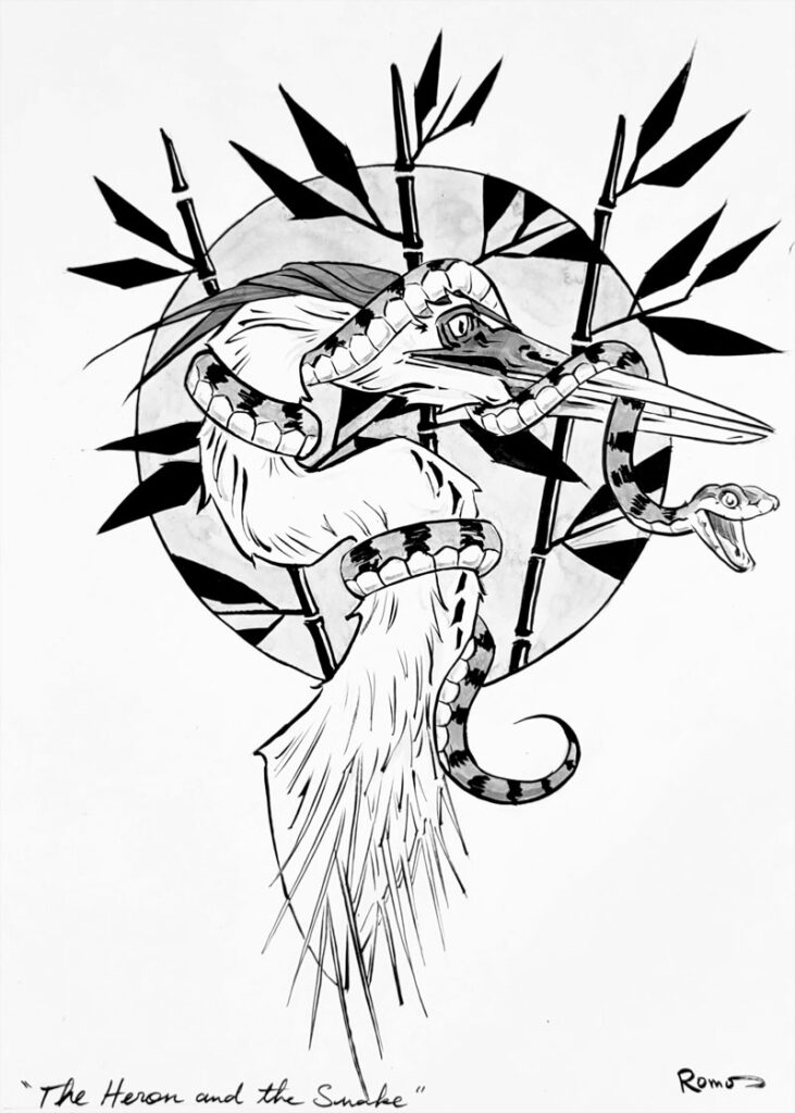 The Heron and the Snake – India ink on Bristol